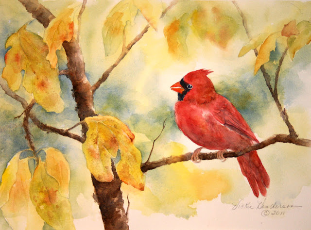 The female cardinal is brownish with some red on her crest, wings and tail. She also has a bright orange bill with black at the base. Click here to see more cardinal images.